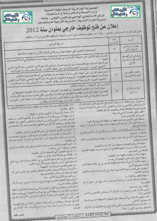 توظيف المركز اللاستشفائي بن فليس التهامي ولايةباتنة Posted: 27 Jan 2013 02:31 AM PST ![]() |