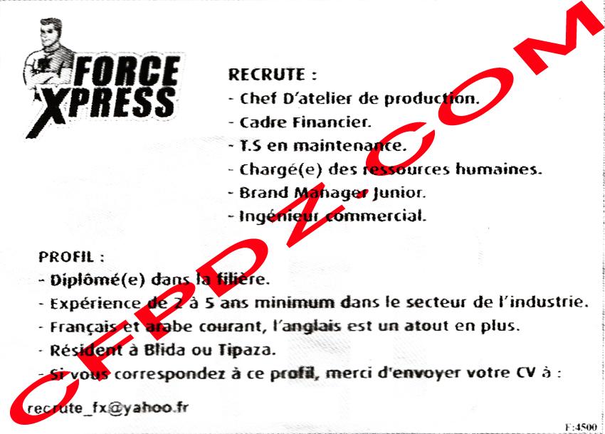 توظيف مؤسسة Force Xpress ماي 2013 Posted: 24 May 2013 04:46 PM PDT توظيف مؤسسة Force Xpress ماي 2013 رئيس ورشة الإنتاج إطار مالي تقني سامي في الصيانة مكلف بالموارد البشرية مهندس تجاري Brand Manager Junior لمعلومات أوفر حول عدد المناصب و كذا شروط المسابقة انتظر تحميل الصورة:  دعواتكم |
