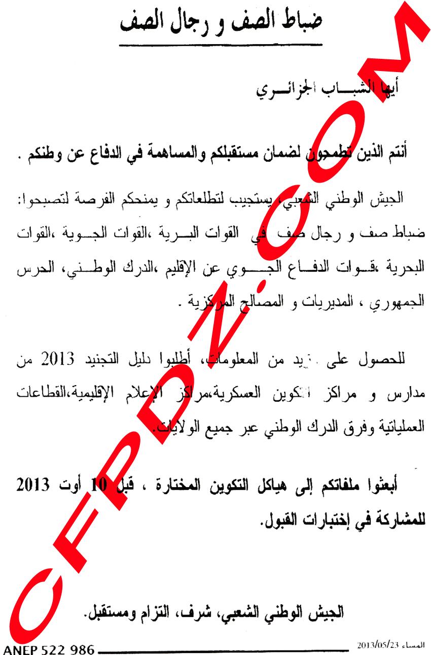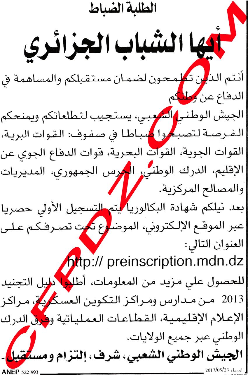 حصريا: توظيف ضباط صف و رجال صف بالجيش الشعبي الوطني ماي 2013 Posted: 24 May 2013 04:23 PM PDT توظيف ضباط صف و رجال صف بالجيش الشعبي الوطني ماي 2013 ضباط صف / رجال صف في: القوات البرية القوات الجوية القوات البحرية قوات الدفاع الجوي الدرك الوطني الحرس الجمهوري المديريات و المصالح المركزية لمعلومات أوفر حول عدد المناصب و كذا شروط المسابقة انتظر تحميل الصورة:  دعواتكم |