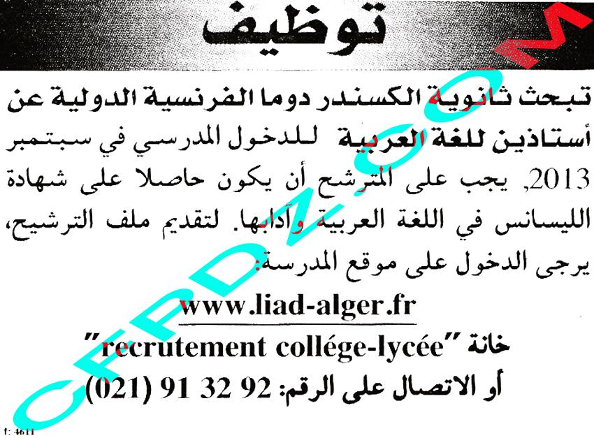 توظيف ثانوية الكسندر دوما الفرنسية الدولية ماي 2013 Posted: 24 May 2013 04:53 PM PDT توظيف ثانوية الكسندر دوما الفرنسية الدولية ماي 2013 أستاذ اللغة العربية لمعلومات أوفر حول عدد المناصب و كذا شروط المسابقة انتظر تحميل الصورة:  دعواتكم |