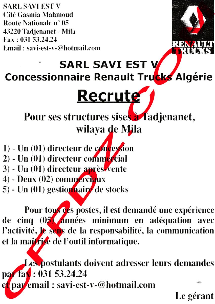 توظيف معتمد علامة رونو تريك Renault Trucks الجزائر ماي 2013 Posted: 24 May 2013 04:32 PM PDT توظيف معتمد علامة رونو تريك Renault Trucks الجزائر ماي 2013 وحدة تاجنانت ميلة مدير وحدة مدير تجاري مدير ما بعد المبيعات تجاريين مسير مخزونات لمعلومات أوفر حول عدد المناصب و كذا شروط المسابقة انتظر تحميل الصورة:  دعواتكم |