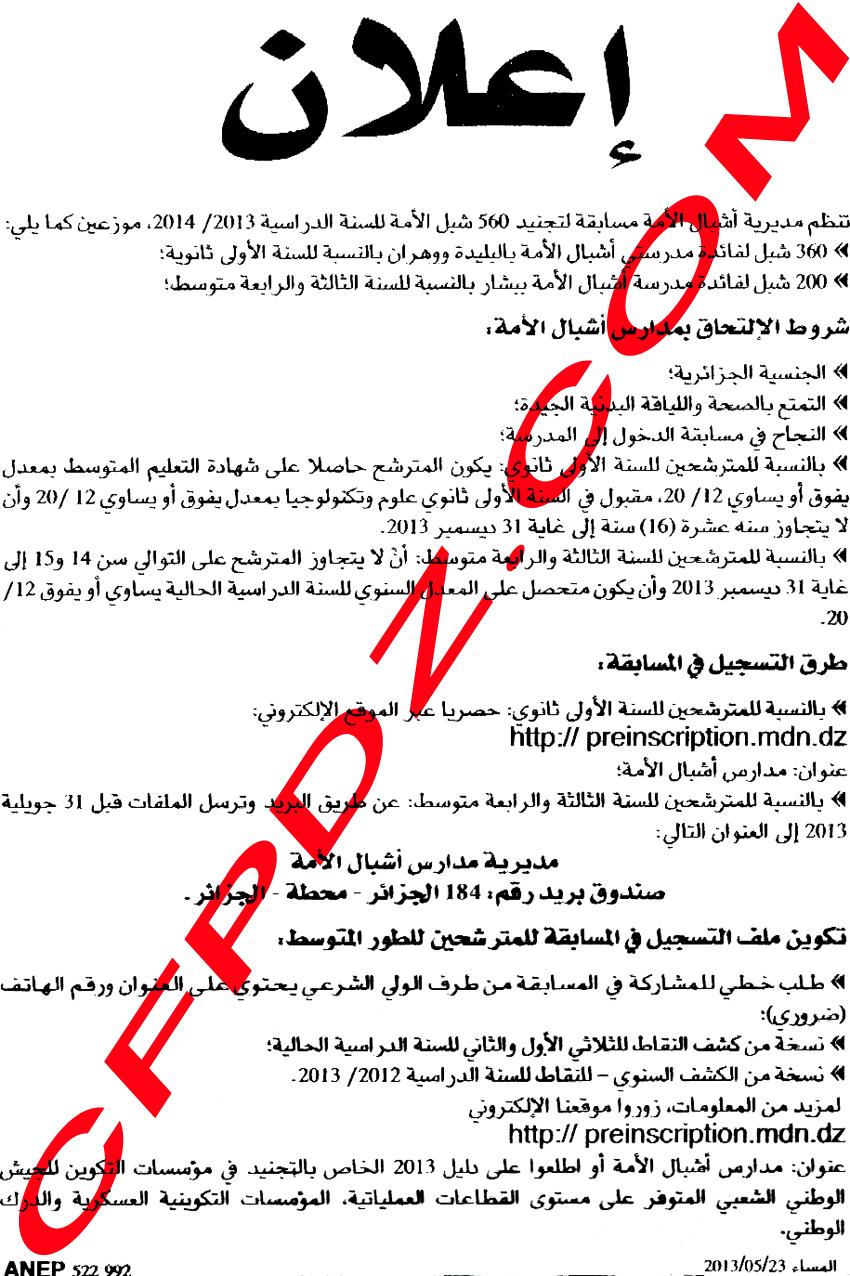 حصري: مسابقة تجنيد مديرية أشبال الأمة البليدة، وهران و بشار ماي 2013 Posted: 24 May 2013 04:26 PM PDT مسابقة تجنيد مديرية أشبال الأمة البليدة، وهران و بشار ماي 2013 560 شبل لمعلومات أوفر حول عدد المناصب و كذا شروط المسابقة انتظر تحميل الصورة:  لا تنسوا ذكر المصدر عند النسخ دعواتكم |