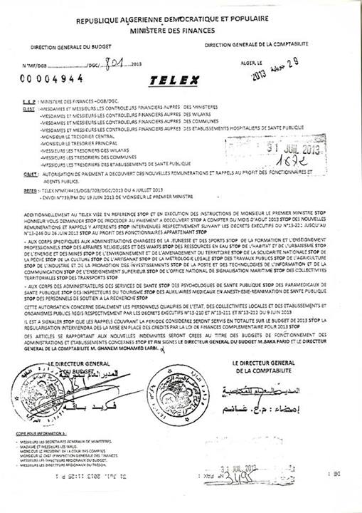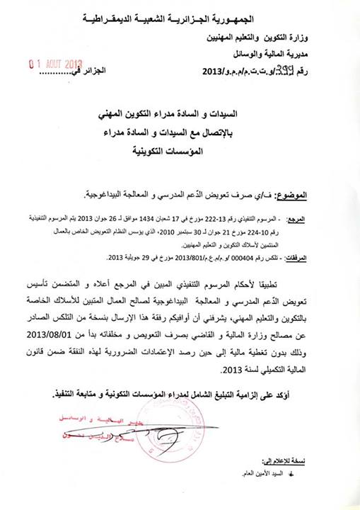 - التعلمية الخاصة بصرف منحة 15 بالمائة ابتداء من 01 أوت 2013